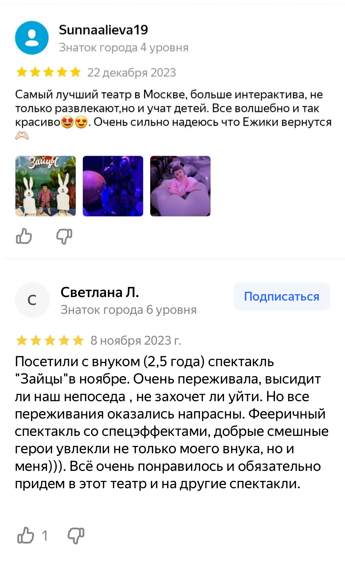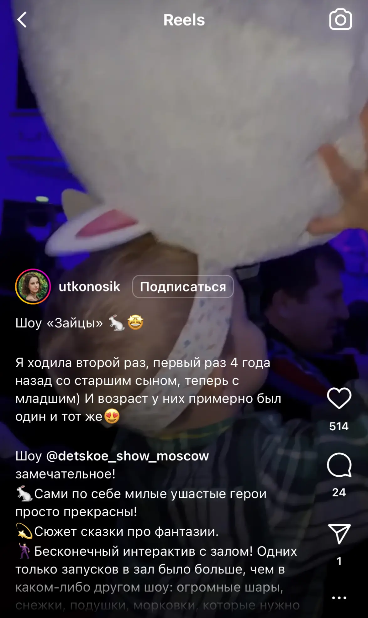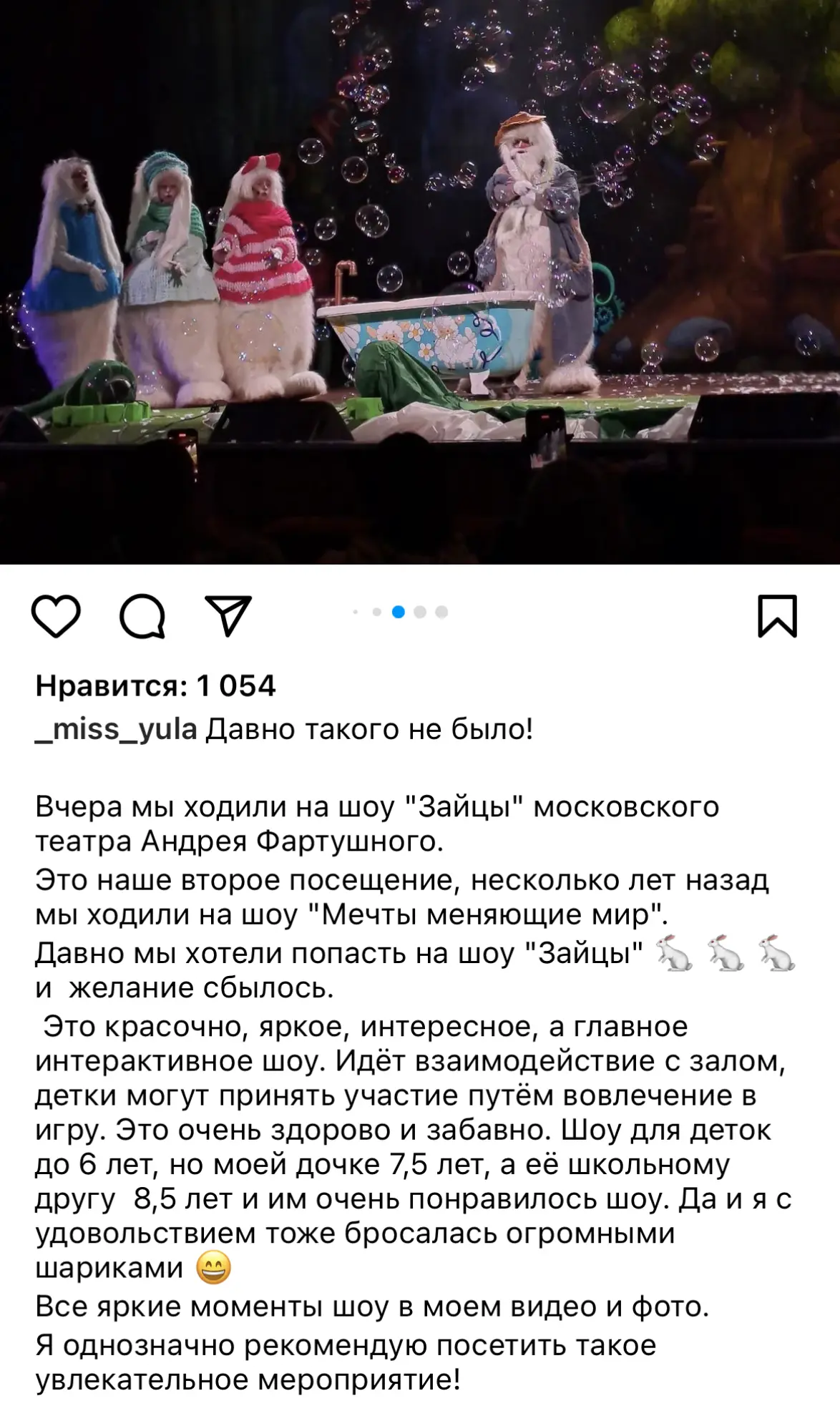 - А еще мы часто получаем восторженные и искренние отзывы от детей страше 6 лет, их родителей, бабушек и дедушек, поэтому можете не сомневаться, что всей семье понравится на шоу-сказке «Зайцы».