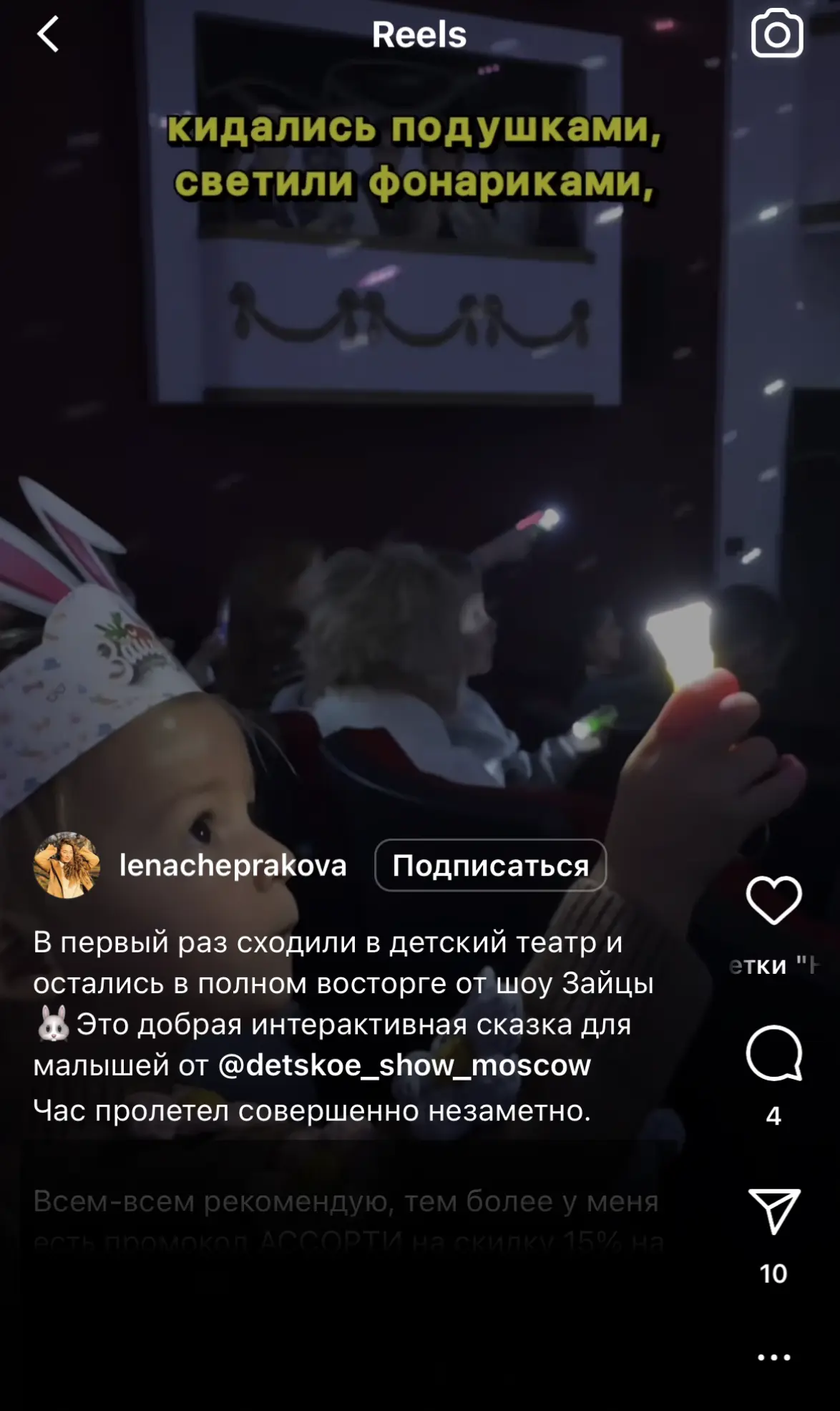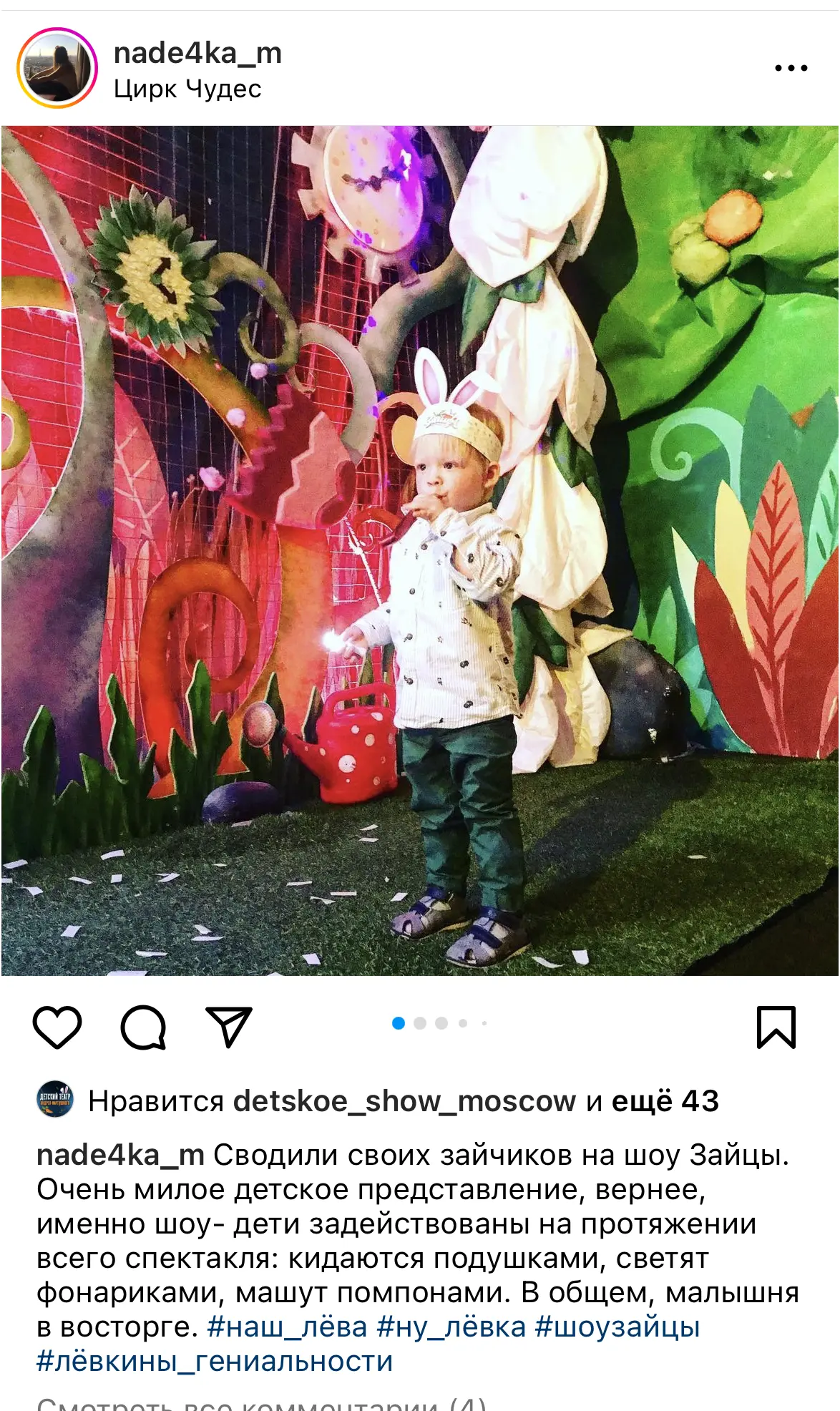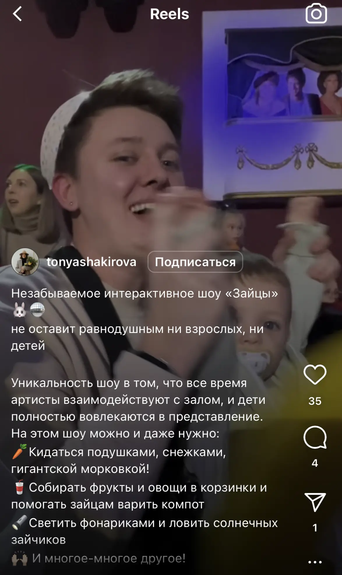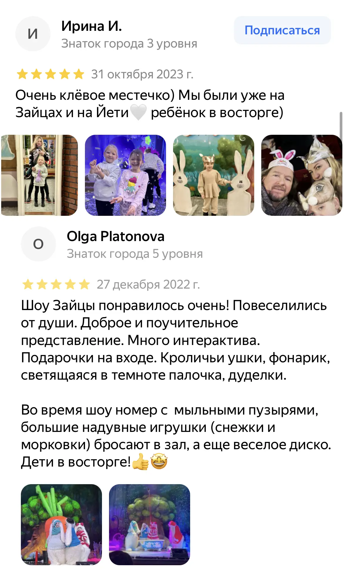 - А еще мы часто получаем восторженные и искренние отзывы от детей страше 6 лет, их родителей, бабушек и дедушек, поэтому можете не сомневаться, что всей семье понравится на шоу-сказке «Зайцы».