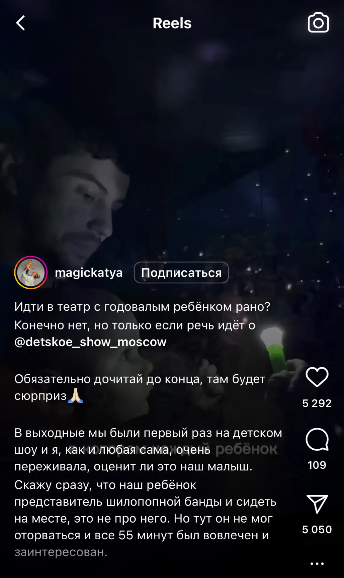 - С Для полного погружения в атмосферу шоу мы выбираем залы, где сцена находится на возвышении, а каждый зрительский ряд выше предыдущего, чтобы всем было комфортно наблюдать за происходящим. Именно поэтому не всем малышам будет удобно на первом ряду и мы рекомендуем эти места для зрителей от 5 лет.
